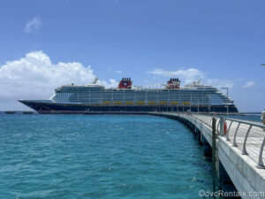 17 Posted: June 20, 2025 The Disney Fantasy cruise ship is seen floating on the water under a sunny blue sky from across the pier at Disney Lookout Cay at Lighthouse Point.