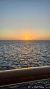 19 Posted: June 20, 2025 An orange and yellow sunrise alights the morning sky in the horizon over the ocean as seen from the Verandah of a Deluxe Oceanview Stateroom with Verandah on the Disney Fantasy.