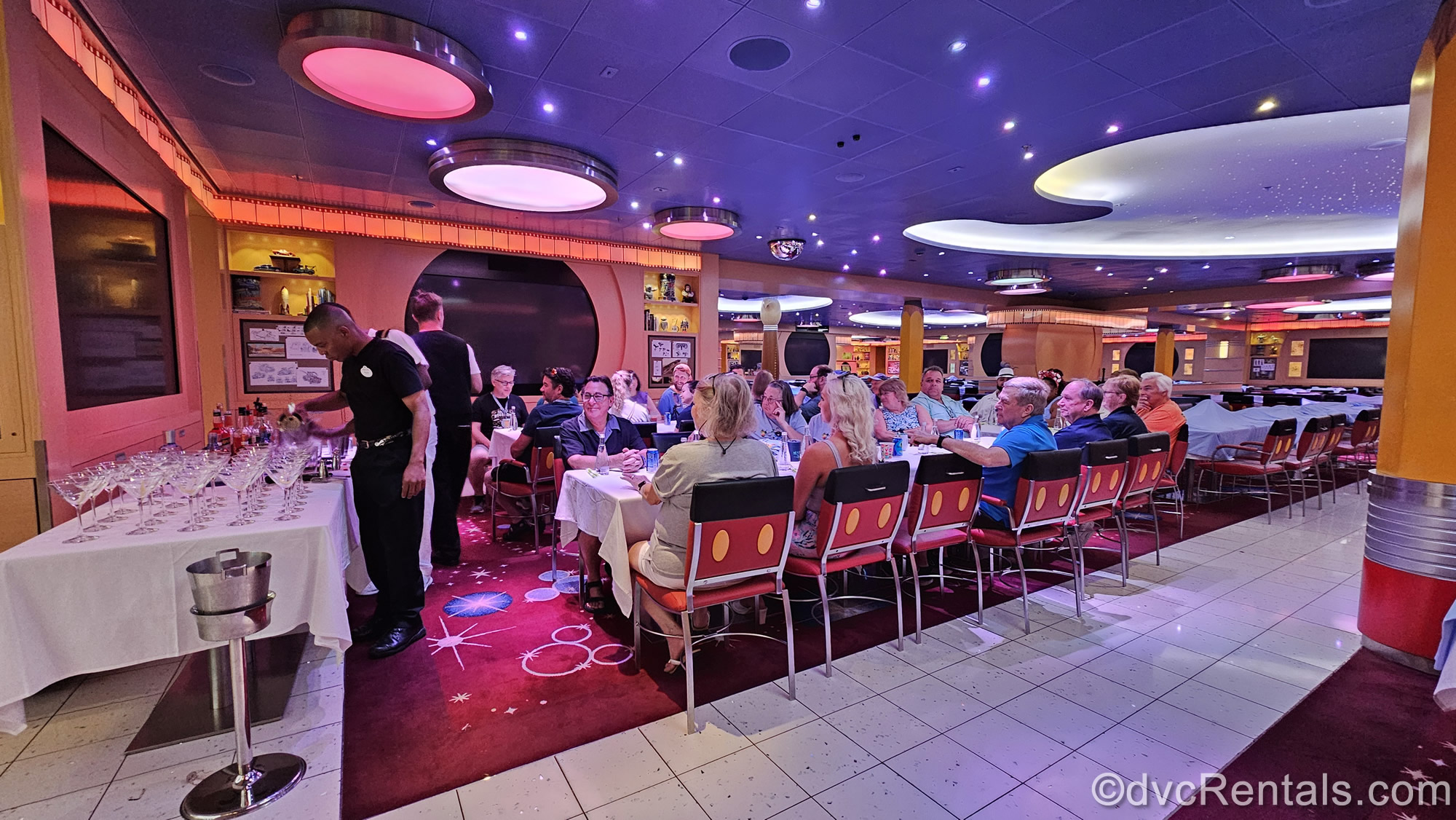 7 Posted: June 20, 2025 Guests and team members of David’s Vacation Club Rentals enjoy a Mixology session in Animator’s Palate onboard the Disney Fantasy cruise ship.