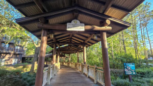 A sign reads “Boulder Ridge Villas at Disney’s Wilderness Lodge, a Disney Vacation Club Resort” above the covered wooden walkway to the villas building. Green foliage surrounds the walkway as the resort exterior is seen on the left and the Running Trail sign is seen on the right.