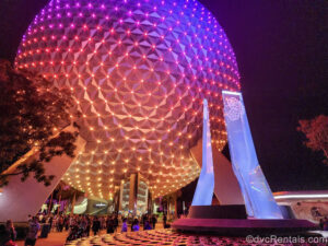 12 Posted: June 10, 2025 Spaceship Earth at EPCOT is illuminated with orange, pink, and purple lights under a night sky as guests walk below past the park entry’s fountain ahead of the ball.