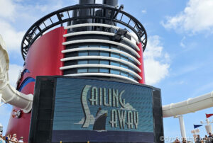 3 Posted: June 10, 2025 The words “sailing away” are displayed on the large video screen on the red funnel of the Disney Fantasy cruise ship, as guests gather to celebrate the deck party that begins their cruise.