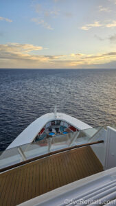 7 Posted: June 10, 2025 The bow of the Disney Dream travels towards the horizon as the sun rises over the ocean ahead.