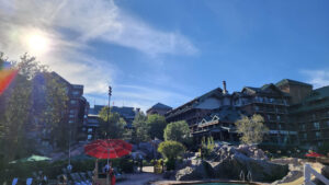 12-feature Posted: March 11, 2025 The Copper Creek Springs Pool at Disney’s Wilderness Lodge is seen under a sunny sky. The log cabin-style resort buildings can be seen in the background.