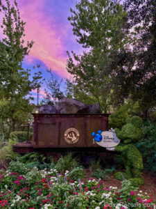 A green foliage topiarary of Mickey Mouse holds a white sign reading “Disney Vacation Club” at Disney’s Wilderness Lodge under a pink and blue sunset. There is a large mine cart containing boulders centered in a garden of white and red flowers as part of the display.