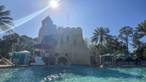 14 Posted: May 27, 2025 The larger-than-life sandcastle structure at the Sandcastle Pool at Disney’s Old Key West Resort is seen under a sunny, morning sky. The waterslide opening is in the shape of Mickey’s head.