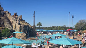 16 Posted: May 27, 2025 Guests swim and hang out around the Lava Pool at Disney’s Polynesian Villas & Bungalows. The large, volcano-inspired rock structure is seen on the left with Cinderella Castle visible in the distance.