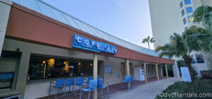 The Cove Bar at the Bay Cove Pool at Bay Lake Tower. Blue barstools line the counter and the resort building’s exterior can be seen in the background