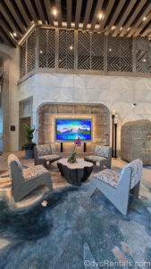 5 Posted: February 18, 2025 4 grey wooden chairs sit around a stone table in the lobby of the Island Tower. The floor is marbled blue to resemble the ocean, and the walls are decorated with geometric designs cut from light wood.