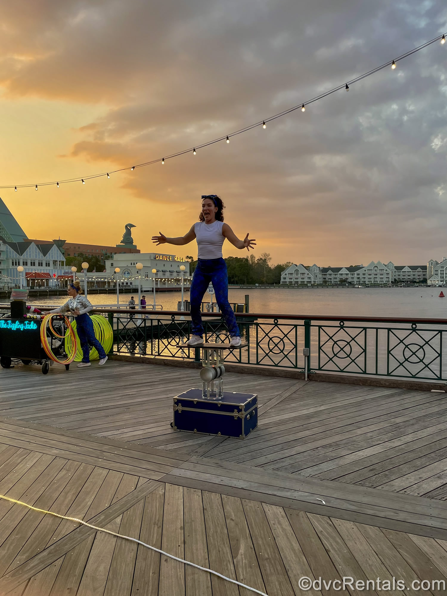 This was our first time staying at one of the Crescent Lake-area resorts (David’s Vacation Club Rentals rents points at Boardwalk Villas and Beach Club Villas!). We enjoyed the chill, fun ambiance of the BoardWalk. You can rent surrey bikes or eat a corn dog, but we most enjoyed watching the energetic performance of a juggling duo. They asked for participants– one of our kids participated in spinning plates with the performers! It’s a delightful way to finish the night (especially if you get a sundae while watching!)
