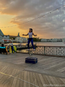 11 Posted: April 8, 2025 A performer balances on a platform at sunset at Disney’s BoardWalk. Resort buildings can be seen in the background, as well as juggling equipment and hoola hoops on a black table.