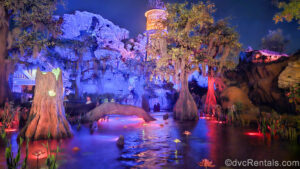 The exterior of Tiana’s Bayou Adventure and the magical bayou water guests glide through on the ride are seen at night. The lighting makes the mountain appear purple as the large water tower featuring Princess Tiana’s tiara is seen in the background amidst the trees.