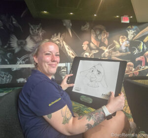 19 Posted: April 29, 2025 DVCR team member holds up her drawing of Valentino from the Disney’s animated film Wish at the Animation Experience at Conservation Station at Animal Kingdom Park.