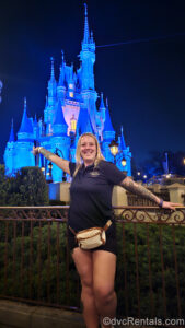 4 Posted: April 29, 2025 DVCR team member Allison poses with a smile and her arms up towards Cinderella Castle at Magic Kingdom at night. The castle in the background is illuminated with blue lighting.