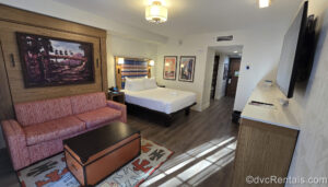 The interior of a Deluxe Studio Resort View at the Boulder Ridge Villas at Disney’s Wilderness Lodge. The Studio is decorated with neutral colors, pops of red, orange, green, yellow, and blue, and features artwork inspired by the great outdoors.