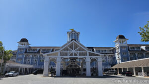 9 Posted: April 29, 2025 The blue and white exterior building of Disney’s Beach Club Villas main entry is seen under a sunny, blue sky as cars pull up to drop off and pick up hotel guests.