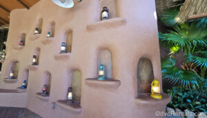 16 Posted: March 18, 2025 Flickering lanterns of varying colors decorate the light brown exterior wall at the entryway for Disney’s Animal Kingdom Villas Kidani Village. Each lantern is shelved into a small notch of the wall.
