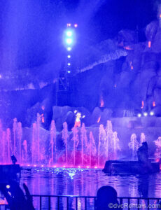 11 Posted: May 20, 2025 Mickey Mouse dances among the water fountain spray during Fantasmic! at Hollywood Studios. Behind him is a large rock mountain used as a set for the show.