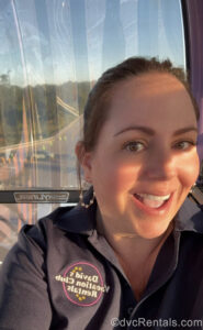 14 Posted: May 20, 2025 David’s Vacation Club Rentals team member Stacy poses with a smile while riding the Disney Skyliner solo.