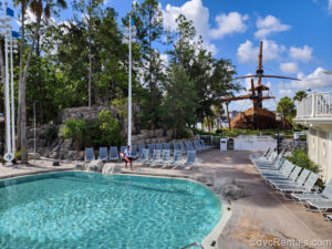 16 Posted: May 20, 2025 The life-size pirate ship waterslide is seen in the distance beyond part of the Stormalong Bay pool area at Disney’s Beach Club Villas.
