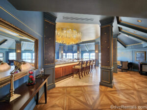 18 Posted: May 20, 2025 Barstools line the bar counter inside Enchanted Rose lounge at Disney’s Grand Floridian Resort & Spa. There is a large golden light fixture above it as the room is decorated with dark blues, dark woods, and a red rose in a glass fixture.