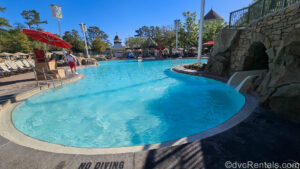 2 Posted: May 20, 2025 This High Rock Spring Pool at Disney’s Saratoga Springs Resort & Spa is seen under a sunny sky. The waterslide entry is visible in the rocks on the right, along with a lifeguard on the left of the pool.