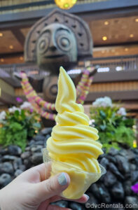 A hand holds up a cup of pineapple Dole Whip soft serve at Disney’s Polynesian Villas & Bungalows.