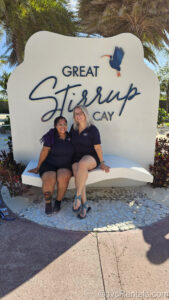 14 Posted: March 4, 2025 David’s Vacation Club Rentals team members Mya and Cassie smile on a bench in front of a sign reading “Great Stirrup Cay” in dark blue lettering, with a blue tropical bird design in the background.
