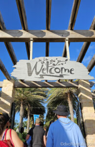16 Posted: March 4, 2025 A wooden arch and sign reading “Welcome” is seen under a blue sky as guests arrive at Great Stirrup Cay. Tall green palm trees are visible in the background as guests pass under the sign.