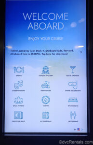 A video screen reading “Welcome Aboard” displays information about the days activities including dining, entertainment, excursions, and more on the Norwegian Joy.