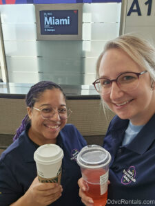 3 Posted: March 4, 2025 David’s Vacation Club Rentals team members Mya and Cassie hold up their drinks in the airport. Behind them is a dark blue information screen reading their flight information to Miami in white lettering.