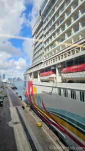 5 Posted: March 4, 2025 The exterior of the Norwegian Joy cruise ship is seen from inside the walkway leading from the terminal to the ship. The pier, ocean, and skyline of Miami can be seen in the distance under a sunny blue sky.