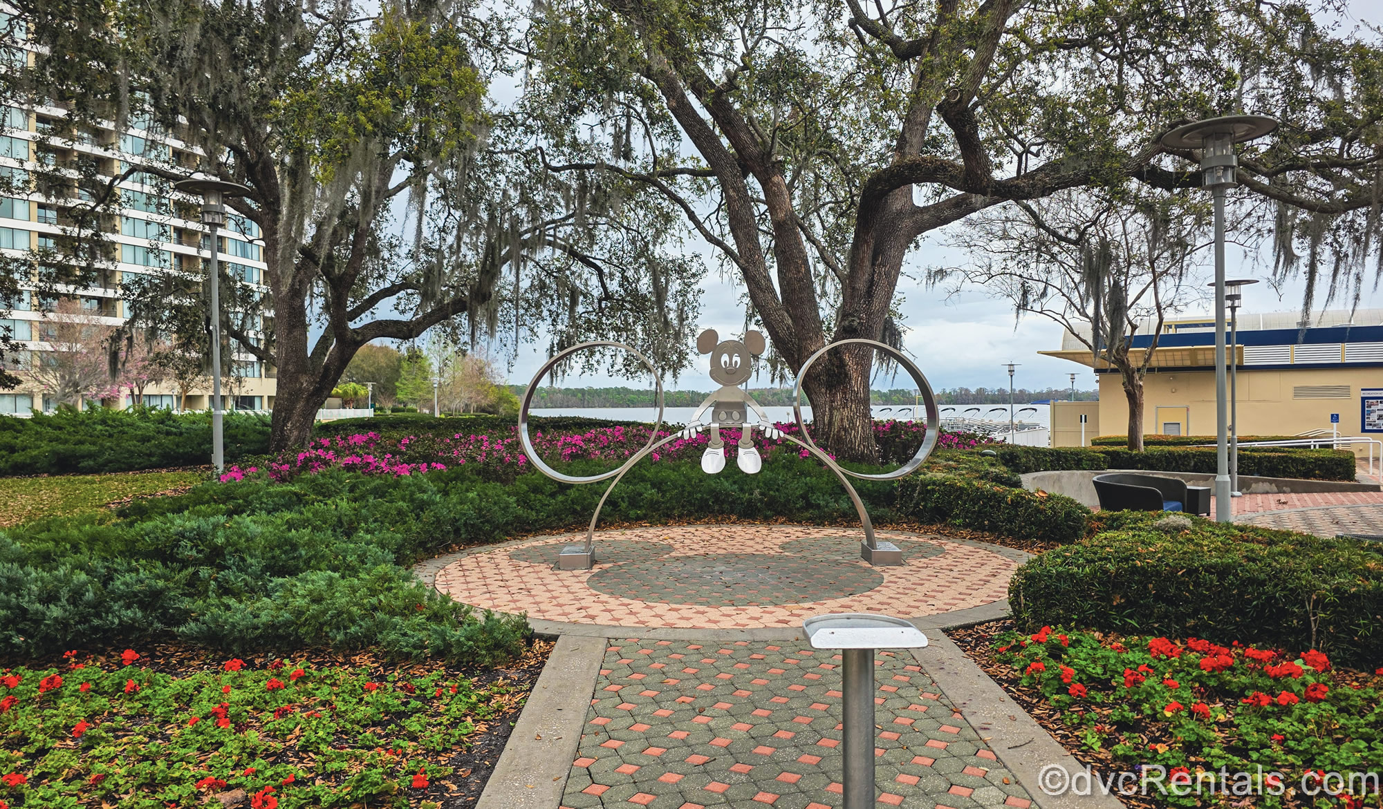 A metallic art display of Mickey Mouse is seen surrounded by green foliage and pink and red flowers at Disney’s Contemporary Resort.