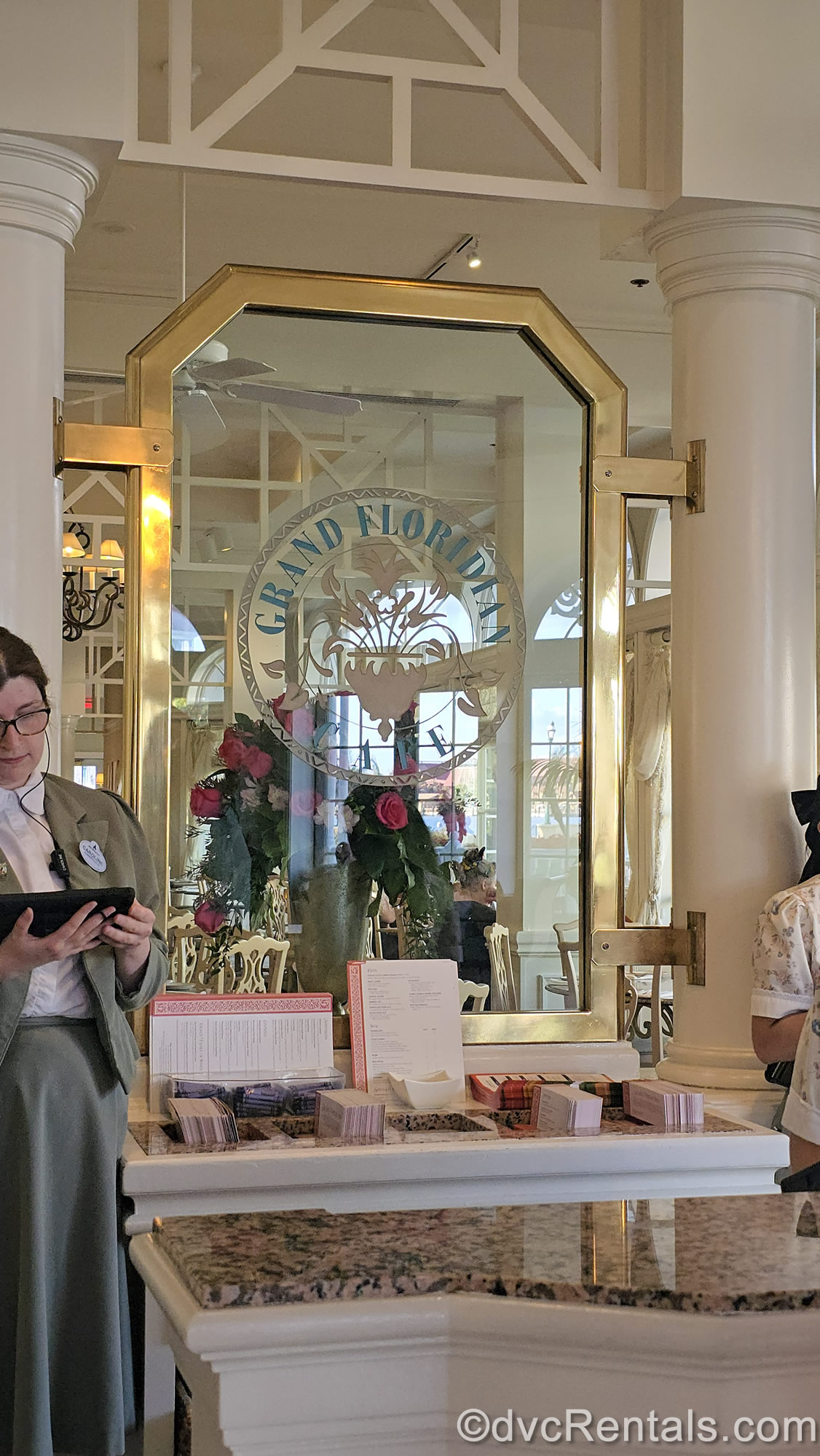 Cast Members prepare to seat guests at the podium entrance to Grand Floridian Café at Disney’s Grand Floridian Resort & Spa.