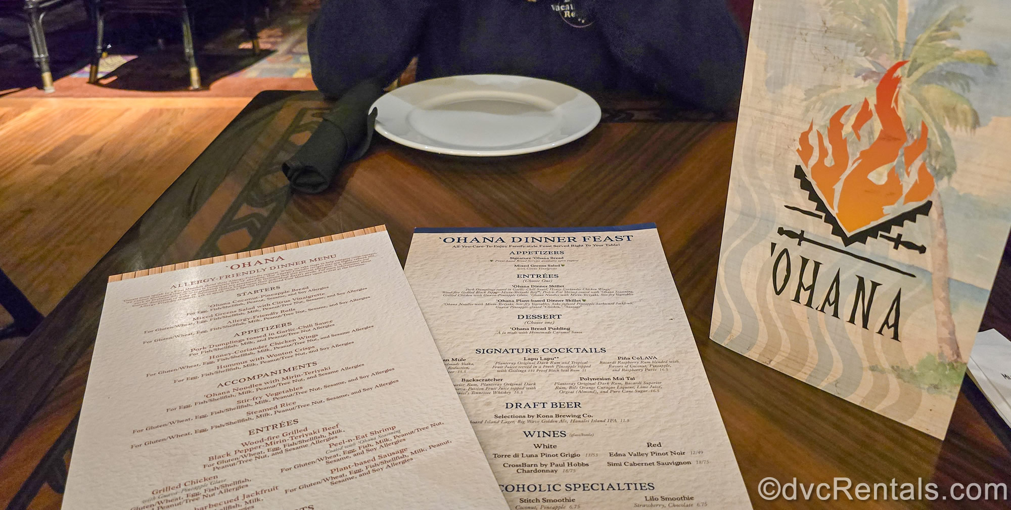 ‘Ohana dinner and allergy menus are seen on a dark wood table inside the restaurant at Disney’s Polynesian Villas & Bunaglows.