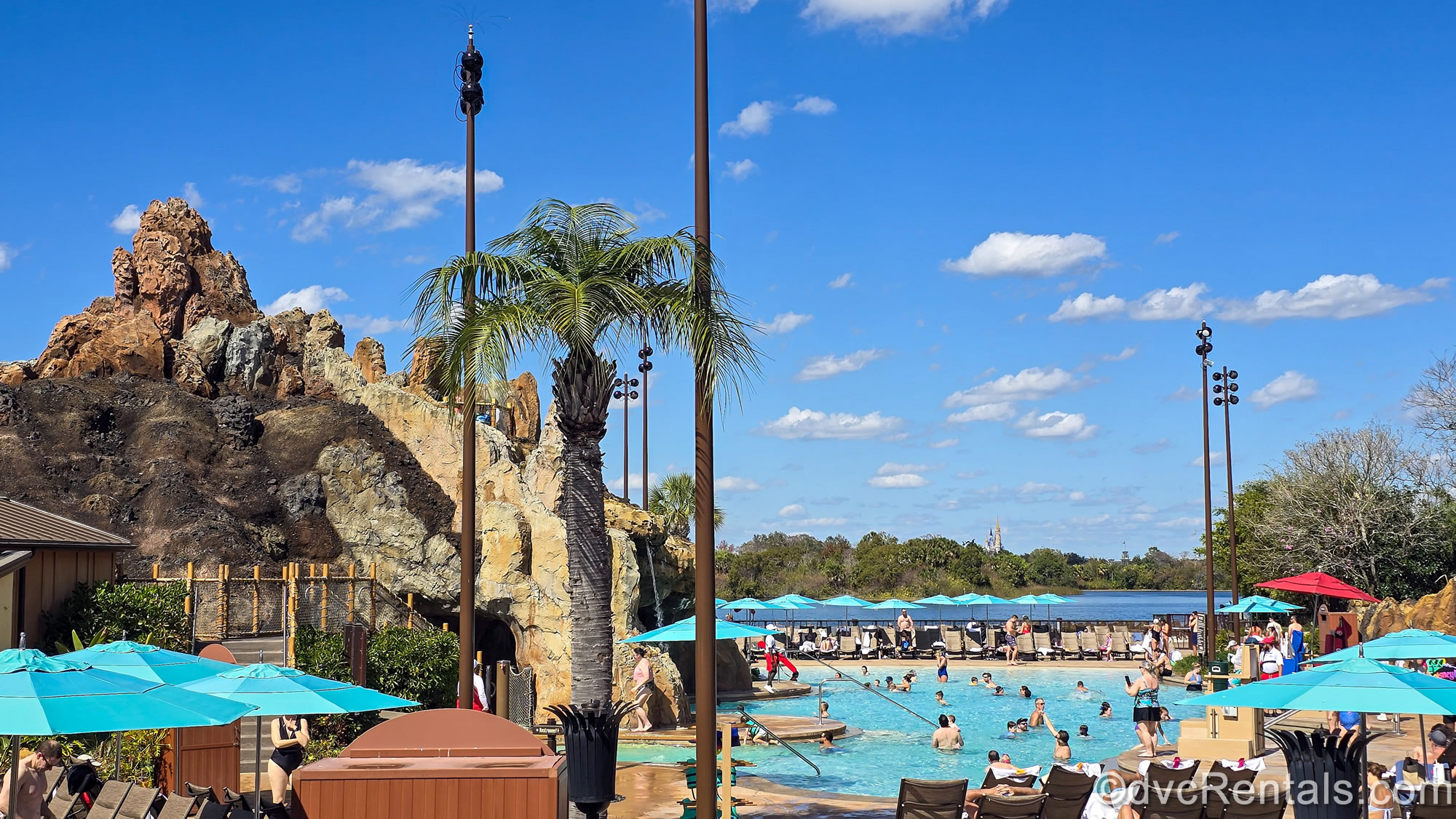 Guests enjoy the Lava Pool at Disney’s Polynesian Villas & Bungalows under a sunny blue sky with Cinderella Castle visible in the distance.