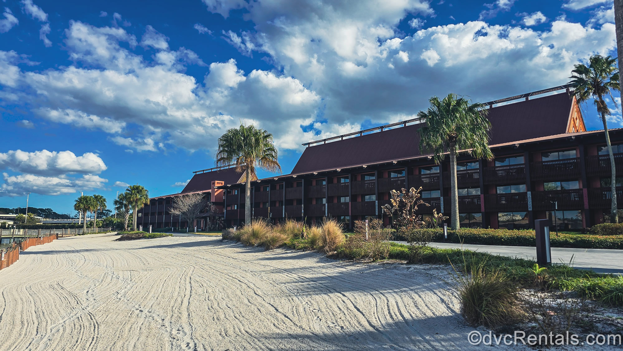 The dark brown exterior of Disney’s Polynesian Villas & Bungalows is seen under a blue sky, with white sand and palm trees lining the Seven Seas Lagoon in front of the buildings.
