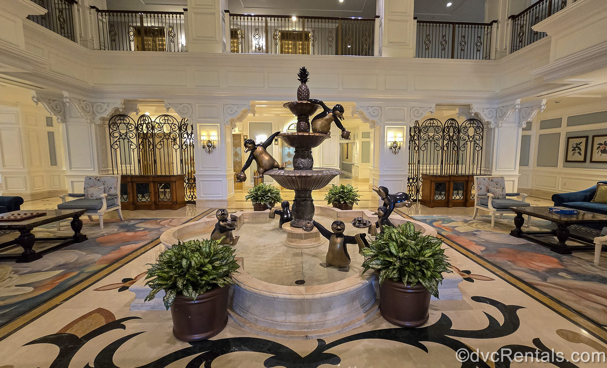 The Mary Poppins-inspired penguin fountain in the lobby of the Villas at Disney’s Grand Floridian Resort & Spa.