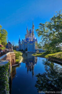 1 Posted: July 22, 2025 Cinderella Castle is seen from the side under a blue sky at Magic Kingdom. The castle’s reflection is seen in the stream of water leading to it as guests use the walkway on the left side.