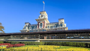 14-feature Posted: July 22, 2025 The grey and red brick Main Street U.S.A. station of the Walt Disney World Railroad is seen overlooking the entry into Magic Kingdom Park at Walt Disney World under a blue sky.