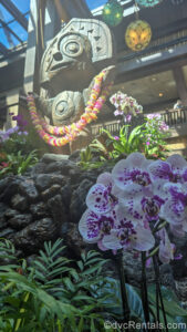 10 Posted: May 13, 2025 A wooden tiki statue with a pink and yellow lei is seen atop a display with some rocks, green foliage, and flowers in the main lobby of Disney’s Polynesian Village Resort.