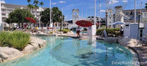 14 Posted: May 13, 2025 Stormalong Bay pool at Disney’s Beach Club Villas is seen under a sunny sky. The sand at the bottom of the pool is visible, as lifeguards watch over things from under red umbrellas.