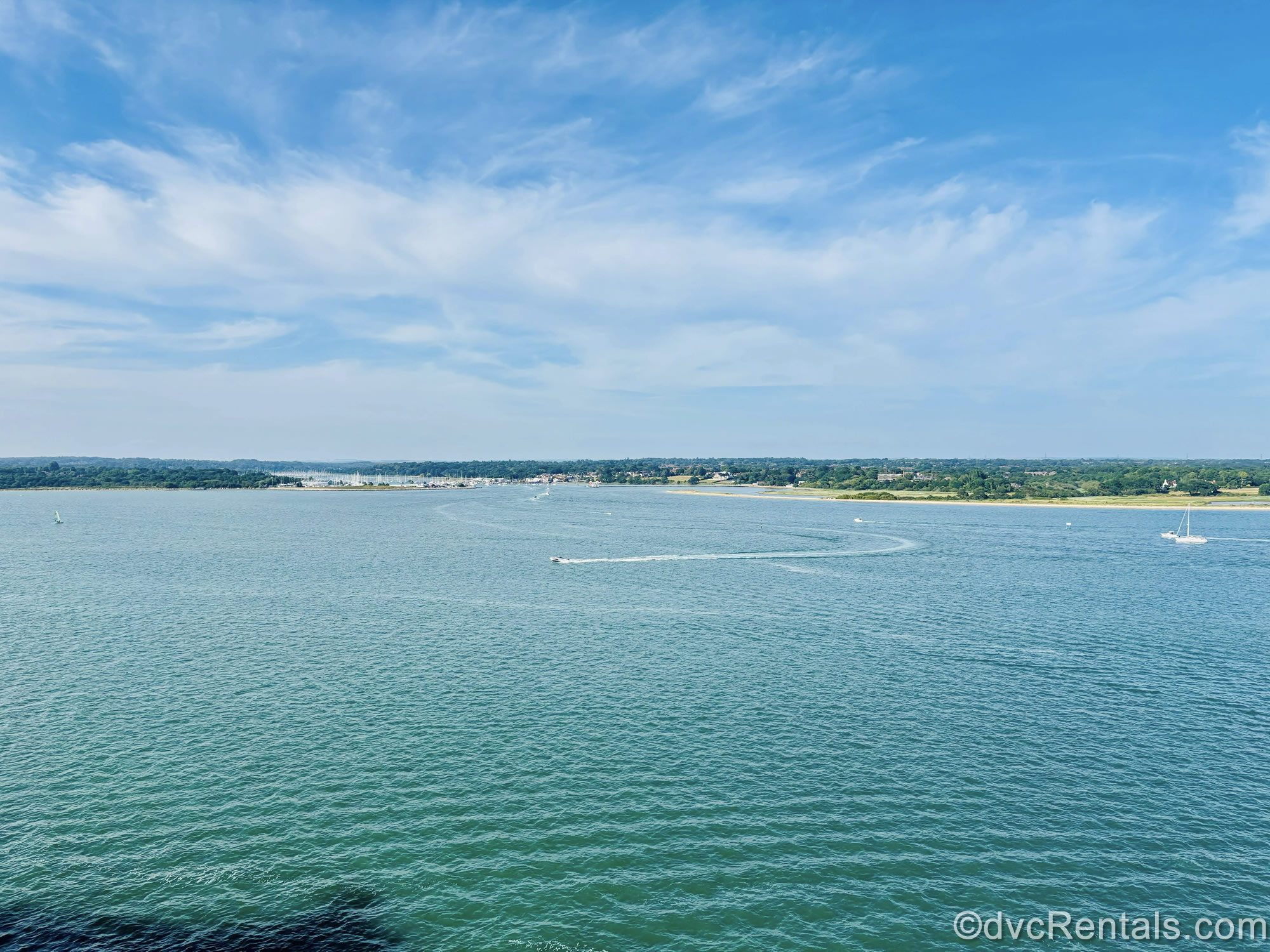 13 Posted: September 30, 2025 The waters of the English Channel, smaller watercrafts, and green fields outside Southampton, England are seen under a blue sky from onboard the cruise ship.