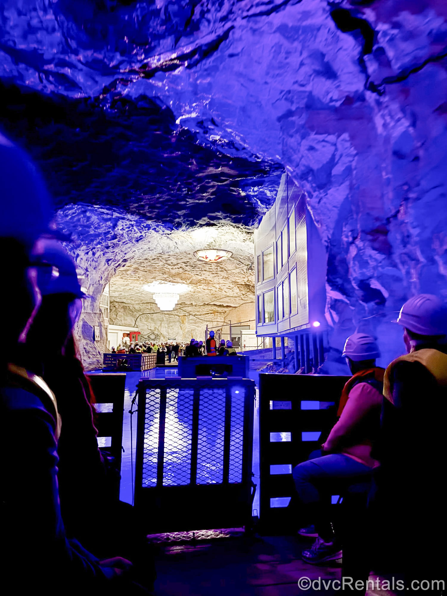 Passengers in hard hats sit on a wooden raft as it floats across the under-mountain waters in the Bergtatt Marble Caves. The interior rock formations of the mines are lit with purple and white lighting.