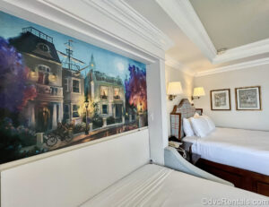 15 Posted: May 6, 2025 A Deluxe Studio at the Villas at Disney’s Grand Floridian Resort & Spa. The queen bed is seen along with the pull-down Murphy bed. Above the Murphy bed there is a Mary Poppins-inspired mural.