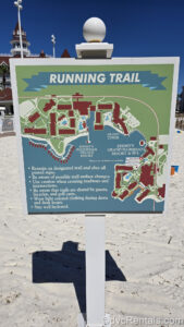 A map displaying the running trail route around Disney’s Grand Floridian Resort & Spa is seen on the white sand beach under a blue sky.