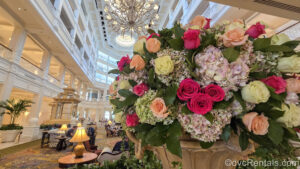 26 Posted: May 6, 2025 The Victorian-inspired main lobby of Disney’s Grand Floridian Resort & Spa is seen behind a large yellow, green, and pink floral arrangement. In the flower display there is a trio of pink roses shaped to form a hidden Mickey.