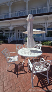 4 Posted: May 6, 2025 A white metal bistro tables with a white umbrella and 4 white chairs, each with a “GF” logo in the back are set out on the red brick patio outside Gasparilla Island Grill at Disney’s Grand Floridian Resort & Spa.