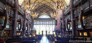 12 Posted: March 25, 2025 The lobby of Disney’s Animal Kingdom Villas Jambo House. The lobby is decorated with brown, yellow, orange, and red tones, along with African art pieces and large floor-to-ceiling windows at one end.