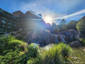 8 Posted: March 25, 2025 The log cabin style exterior of Disney’s Wilderness Lodge is seen under a sunny sky. In front of the building is a small rockface and water feature surrounded by green foliage and small, yellow, wildflowers.